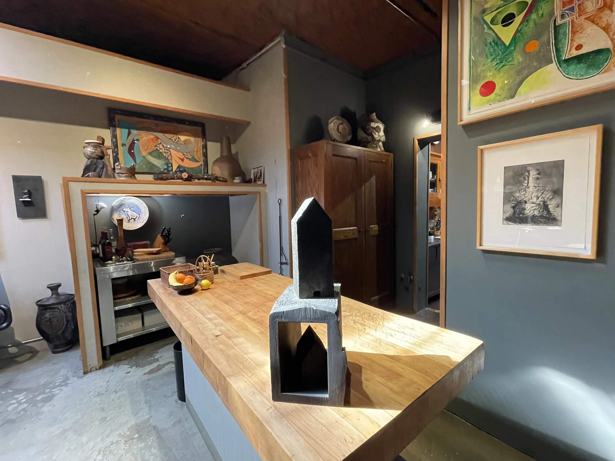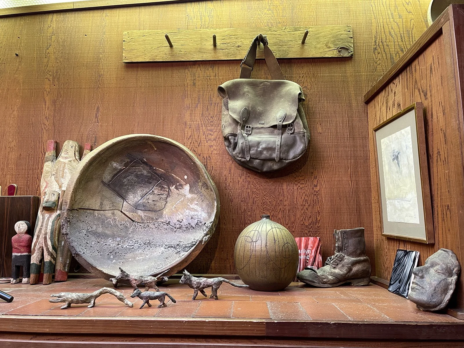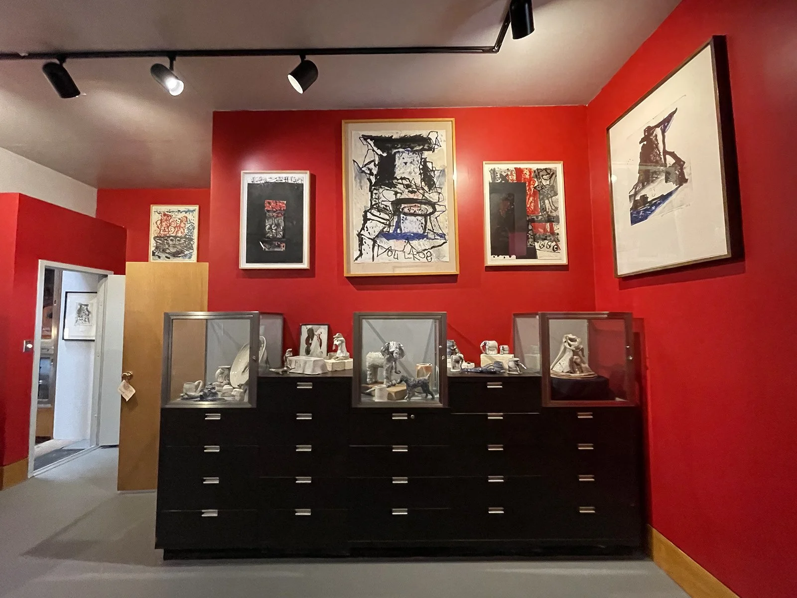 [Image Description: a photo of a room lined with filing cabinets, drawers, framed abstract artwork, and several ceramic plates. There’s a wooden table in the center of the room with a paper cutter, a file organizer, some office supplies, and a painting on paper by Peter Voulkos.]