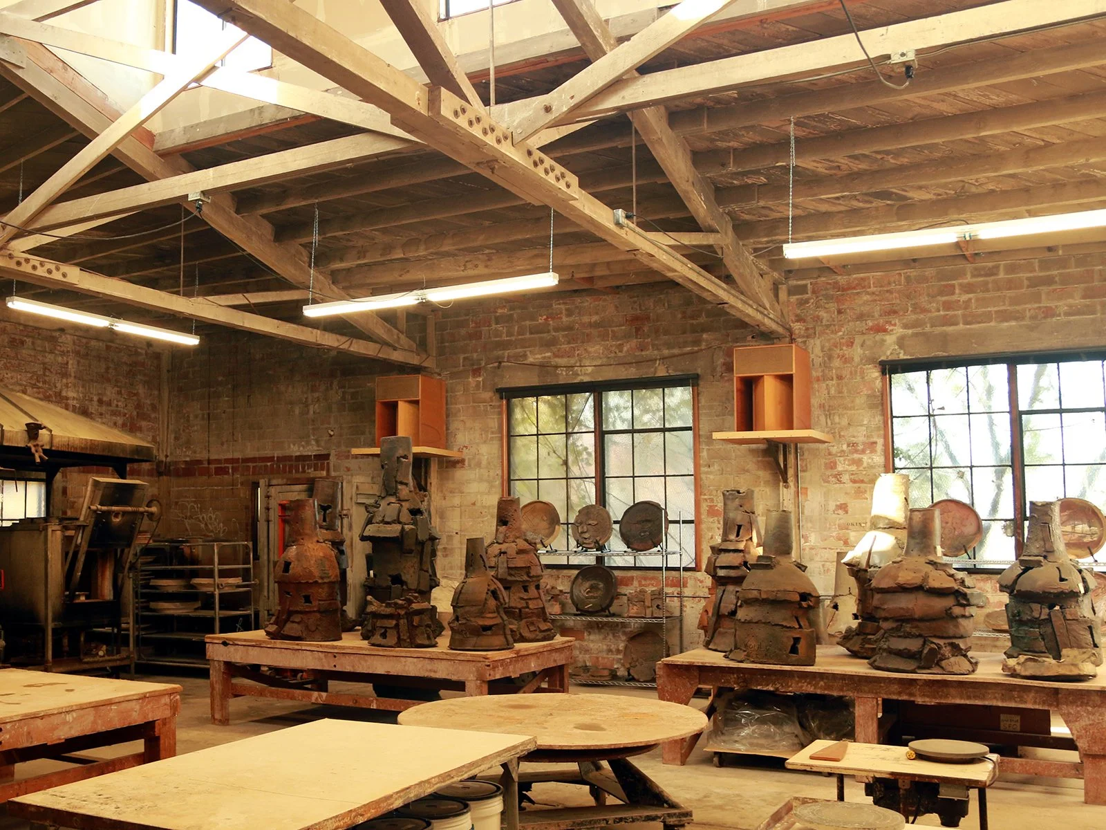 A collection of molds for the bronze editions (left) and two large paintings on canvas (right) by Peter Voulkos